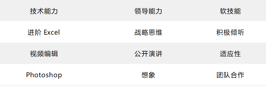 第一步是根据组织的策略来确定要包括在清单中的技能类型。例如,你可以将这些技能分为三个领域:技术技能,软技能和领导能力。(专业、通用、领导能力)