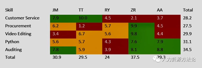 快速浏览此表将显示该组织缺乏“采购”这一技能,而平均而言,他们擅长审计。在这种情况下,TT的采购得分最低,而ZR的得分最高。在这种情况下,实施非正式的学习干预将使TT能够指导和指导ZR的采购技能。